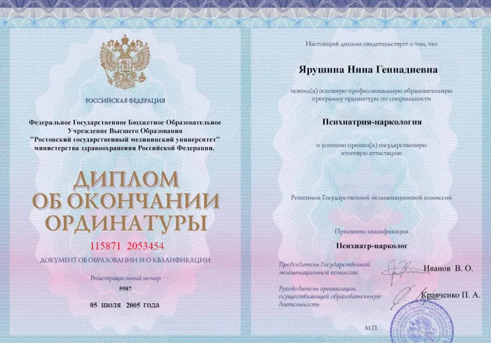 • 2006 — Ростовский государственный медицинский университет (Психиатрия-наркология).